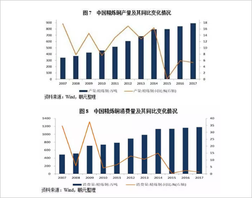 中國(guó)是全世界最大的銅冶煉國(guó)和精煉銅消費(fèi)國(guó),去年精煉銅的產(chǎn)量大概為890萬(wàn)噸,占全球產(chǎn)量41.56%,并且超過(guò)了智利、日本和美國(guó)的產(chǎn)量之和。去年的精煉銅消費(fèi)量達(dá)到1179萬(wàn)噸,占據(jù)全球消費(fèi)量的50.26%,其中電力消費(fèi)占比超50%。由此可見(jiàn),我國(guó)的精煉銅產(chǎn)量及消費(fèi)量,都是持快速上漲的階段,我國(guó)的精煉銅產(chǎn)能過(guò)剩也日益突出。今年上半年,我國(guó)的銅礦新增產(chǎn)能不大,所以整個(gè)精煉銅呈現(xiàn)出寬松的局面,去庫(kù)存化緩慢;美聯(lián)儲(chǔ)加息周期依舊,致使美元指數(shù)大幅上漲,春節(jié)過(guò)后,消費(fèi)也不如預(yù)計(jì)的理想,銅價(jià)不斷下調(diào)。5月份開(kāi)始,中美貿(mào)易戰(zhàn)對(duì)銅的短期供需影響有限,重要主要是增加了全球經(jīng)濟(jì)增長(zhǎng)的不確定性因素,從而導(dǎo)致銅價(jià)走低。